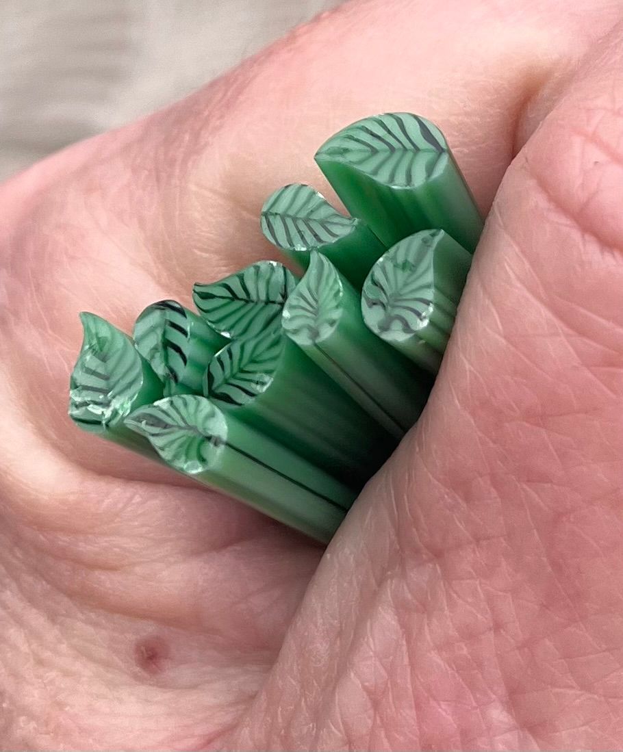 These beautiful glass leaves capture tiny intricate veins and textures of a real leaf. Crafted with various patterns during the pull gives them intricate designs adding depth. The edges are smooth mimicking the natural curves of real foliage giving your glass pieces a sense of fluidity and organic beauty. Our Bullseye Coe 90 Glass Murrini is hand, pulled in our little shop in Wisconsin. As Glass is heated and begins to flow each pull is individual. The pattern can fluctuate from the beginning to the end. Many times, changing it completely. Our cane is sold by the ounce and many times it is over
